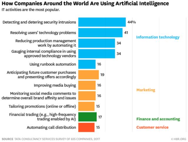现在有许多AI解决方案可以解决IT,人力资源和财务/会计的后台功能。例如通过自动化技术处理密码重置来节省时间,而不是让您的技术人才浪费时间在这个平凡的任务上。或者,AI可能被用来询问所有申请人或新员工所需的标准化系列问题来为人力资源部门省出更多的工作时间。